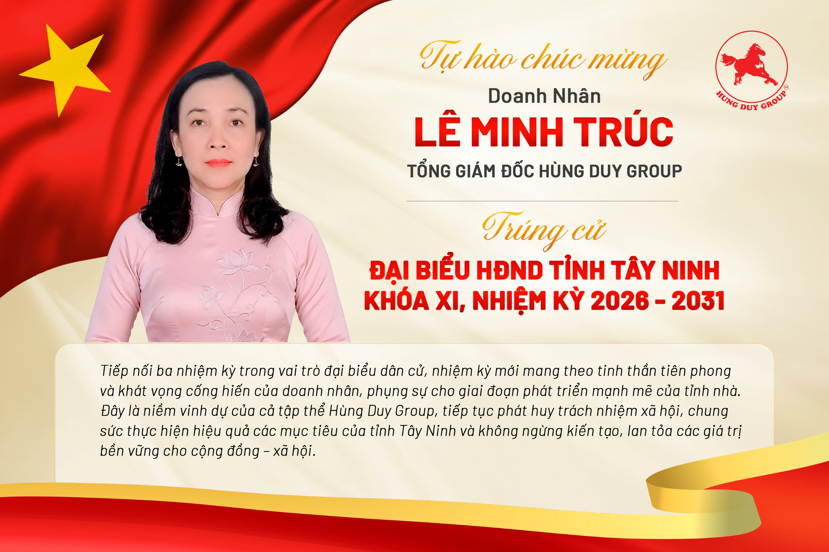 Theo công bố từ Ủy ban Bầu cử tỉnh Tây Ninh ngày 19/03/2026, với sự tín nhiệm từ cử tri, Chị Lê Minh Trúc – Tổng Giám đốc Tập đoàn Hùng Duy đã chính thức trúng cử Đại biểu HĐND tỉnh Tây Ninh nhiệm kỳ 2026 – 2031.