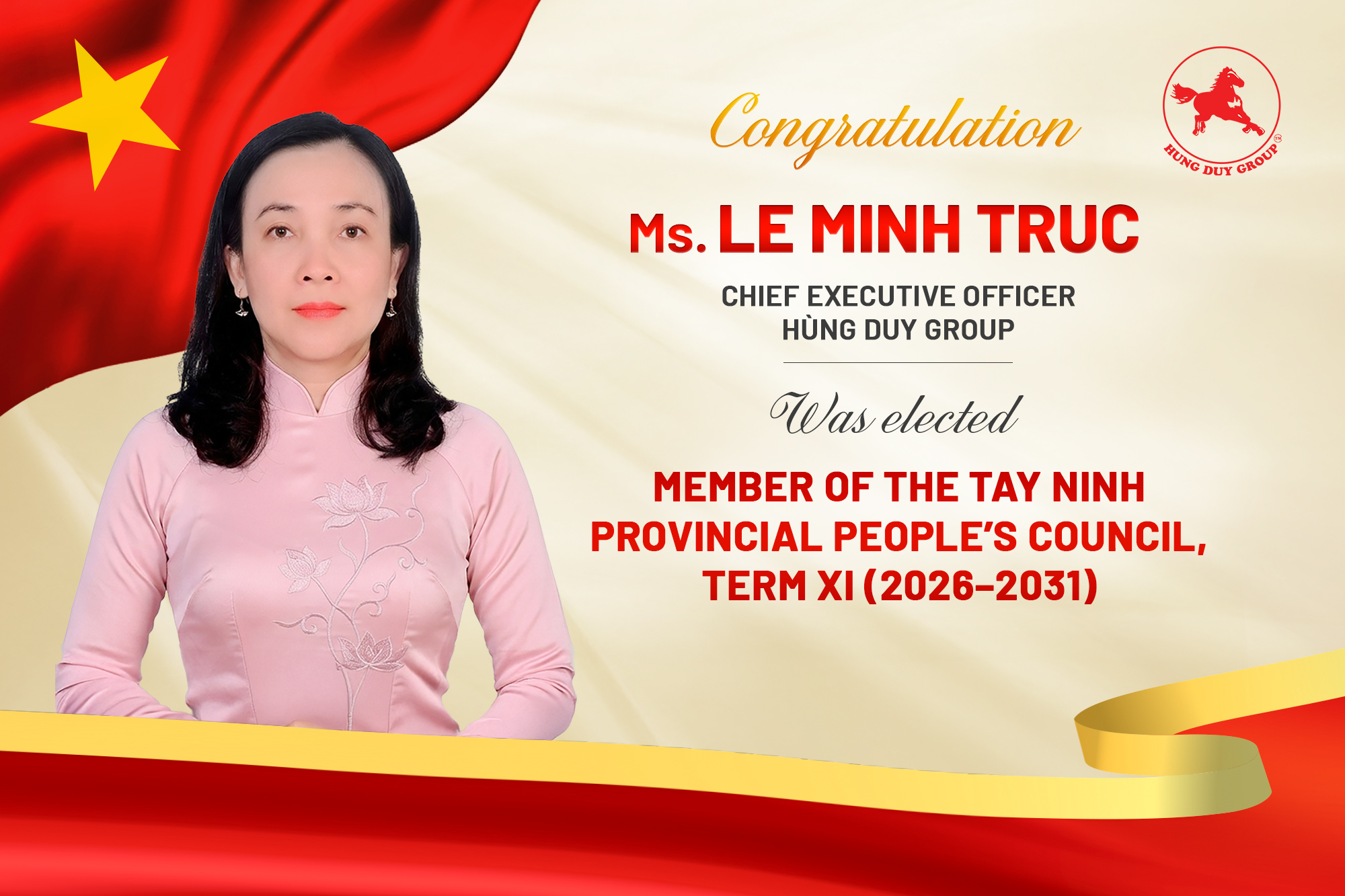 According to the announcement issued by the Tây Ninh Provincial Election Committee on March 19, 2026, Ms. Le Minh Truc – Chief Executive Officer of Hung Duy Group – has officially been elected as a Member of the Tây Ninh Provincial People’s Council for Term XI (2026 – 2031), with strong voter support.